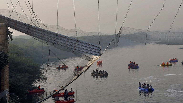 Aproximadamente 500 personas estaban caminando sobre una estructura colgante en Morbi, cuando los cables empezaron a ceder hasta que ésta se desplomó.